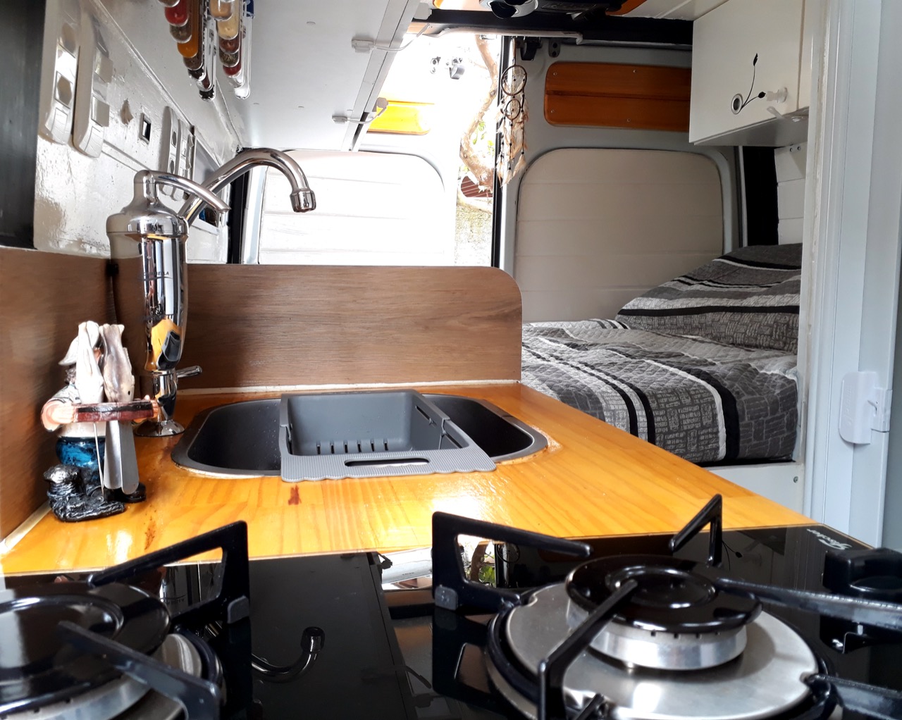 Entre o projeto e finalização foi mais de um ano. Durante este período construíram dentro de uma Van a sua própria casa em um pequeno espaço com praticamente tudo que se precisa. Tem cama de casal, cozinha com pia e frigobar, banheiro com chuveiro quente, um espaço para poltrona com mesa de trabalho, que se transforma em uma cama de solteiro, além do espaço na gabine do motorista.