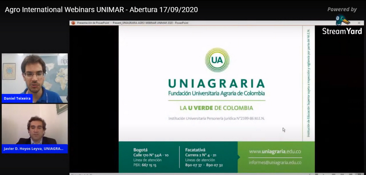 A Universidade de Marília (Unimar) realizou a abertura da série de palestras do 1º Agro Internacional Webinars Unimar. O evento foi idealizado pelo Grupo de Estudos Agronômicos da Unimar (GEAU) e o Núcleo Integrado de Pesquisa e Extensão (NIPEX), com o objetivo de fomentar a internacionalização dos acadêmicos do curso de Engenharia Agronômica.
