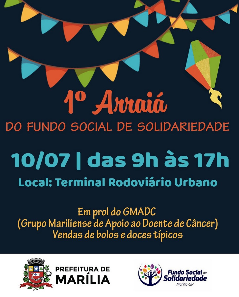 O Fundo Social de Solidariedade de Marília irá promover nesta quarta-feira (10), das 9h às 17h, no Terminal Rodoviário Urbano, na região central da cidade, o seu 1º Arraiá em prol do GMADC (Grupo Mariliense de Apoio ao Doente de Câncer).