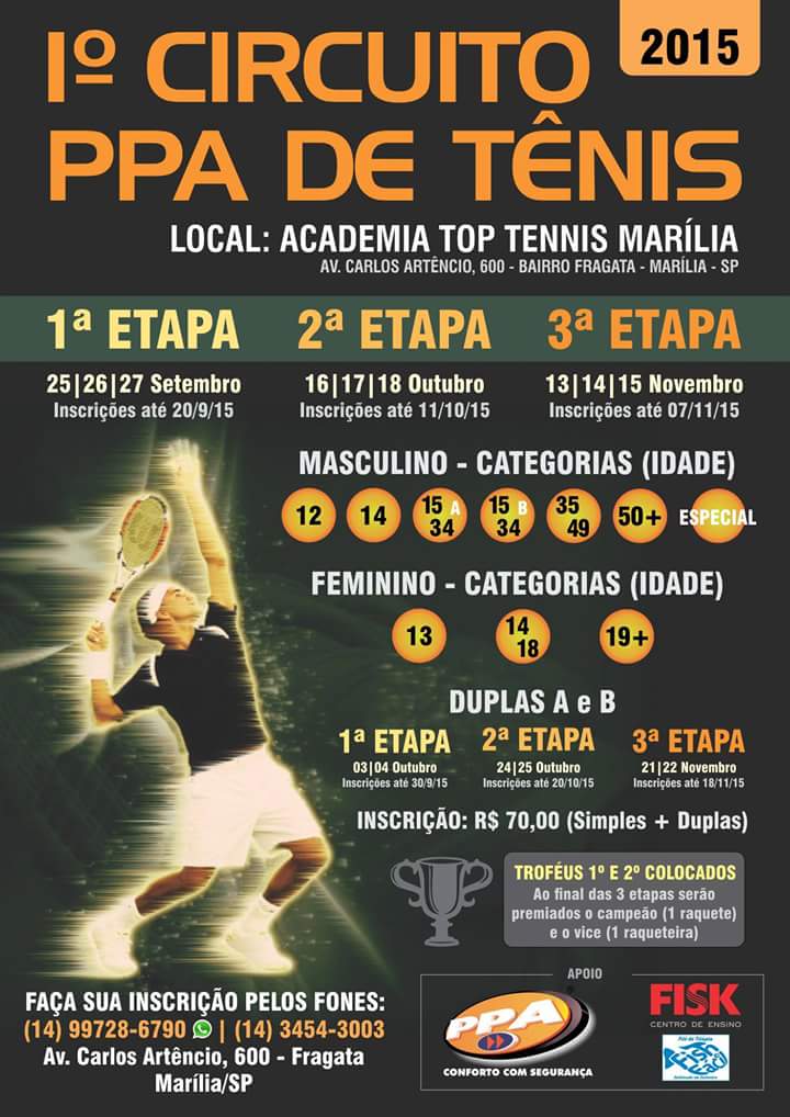 A Academia Top Tennis realiza a partir deste fim de semana o 1º Circuito PPA que será dividido em três etapas. As inscrições para a primeira etapa podem ser feitas até hoje (terça, dia 22). O evento será realizado na própria academia, localizada na avenida Carlos Artêncio, 600 - bairro Fragata.
