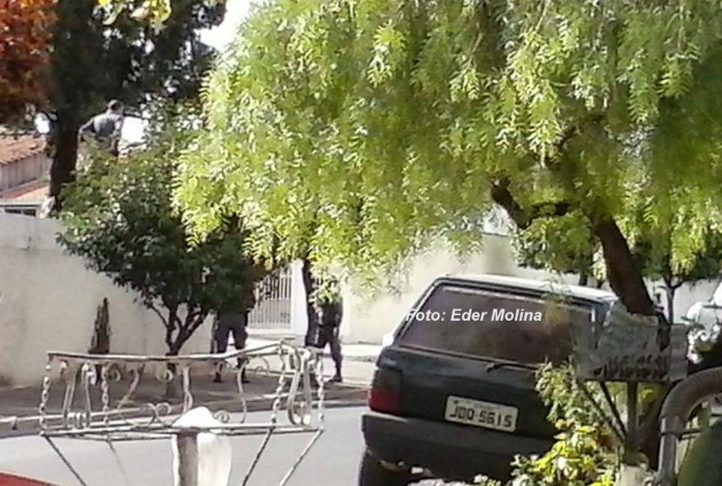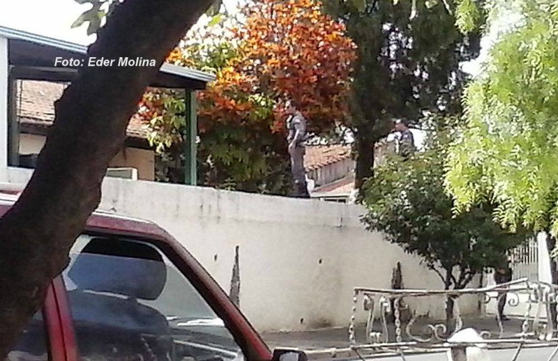 Pelas fotos, é possível verificar o momento em que os policiais ambientais adentram à residência, inclusive ainda em cima do muro para averiguar melhor a ocorrência. Eles permanecem no local.