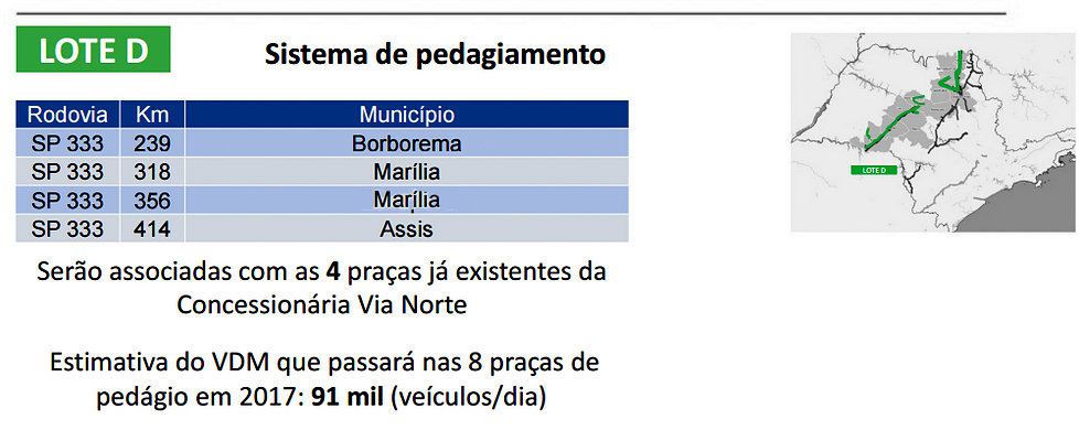 No lote D, as praças de cobrança na SP-333 devem ser colocadas em Borborema (km 239) Marília (km 318 e km 356) e Assis (km 414). O KM 318, por exemplo, fica antes do acesso ao distrito de Rosália (pouco depois do Country Clube). Portanto, os moradores de Rosália que precisarem vir para Marília terão que pagar a tarifa. Se a praça fosse instalada um quilômetro à frente do previsto já evitaria essa despesa.