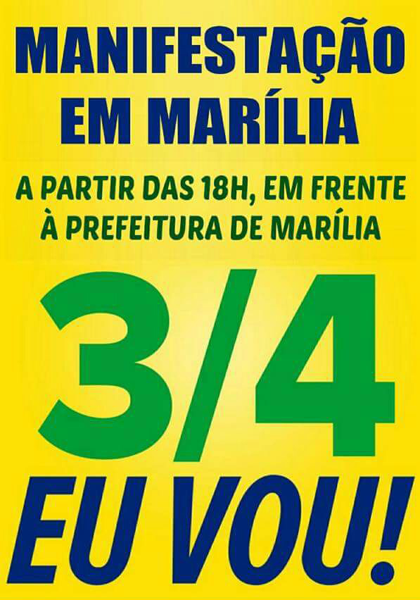Nesta terça-feira (03), a partir das 18h, marilienses que defendem a democracia, a ética na política e o fim da corrupção, estarão realizando uma manifestação. A concentração será em frente ao Paço Municipal.