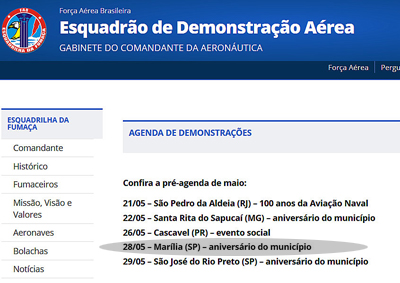 prevista uma nova apresentação em Marília. De acordo com a agenda de demonstrações no site do EDA (Esquadrão de Demonstração Aérea), a apresentação está programada para o próximo dia 28 de maio, em comemoração ao aniversário do Município.