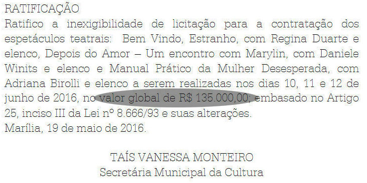Durante a semana, a Prefeitura publicou um edital de ratificação de licitação para contratação de três especáculos: “Bem Vindo, Estranho”, com Regina Duarte e elenco, “Depois do Amor – Um encontro com Marylin”, com Daniele Winits e elenco e “Manual Prático da Mulher Desesperada”, com Adriana Birolli e elenco.