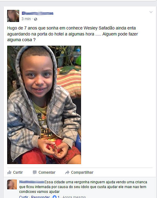 Várias pessoas que também foram ao hotel para tentar um contato com o artista ficaram sensibilizadas com o esforço da criança e, a partir daí, passaram a postar mensagens no Facebook e também no WhatsApp do portal Visão Notícias.com (99700-2463).