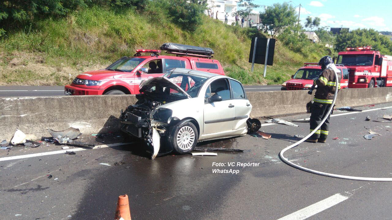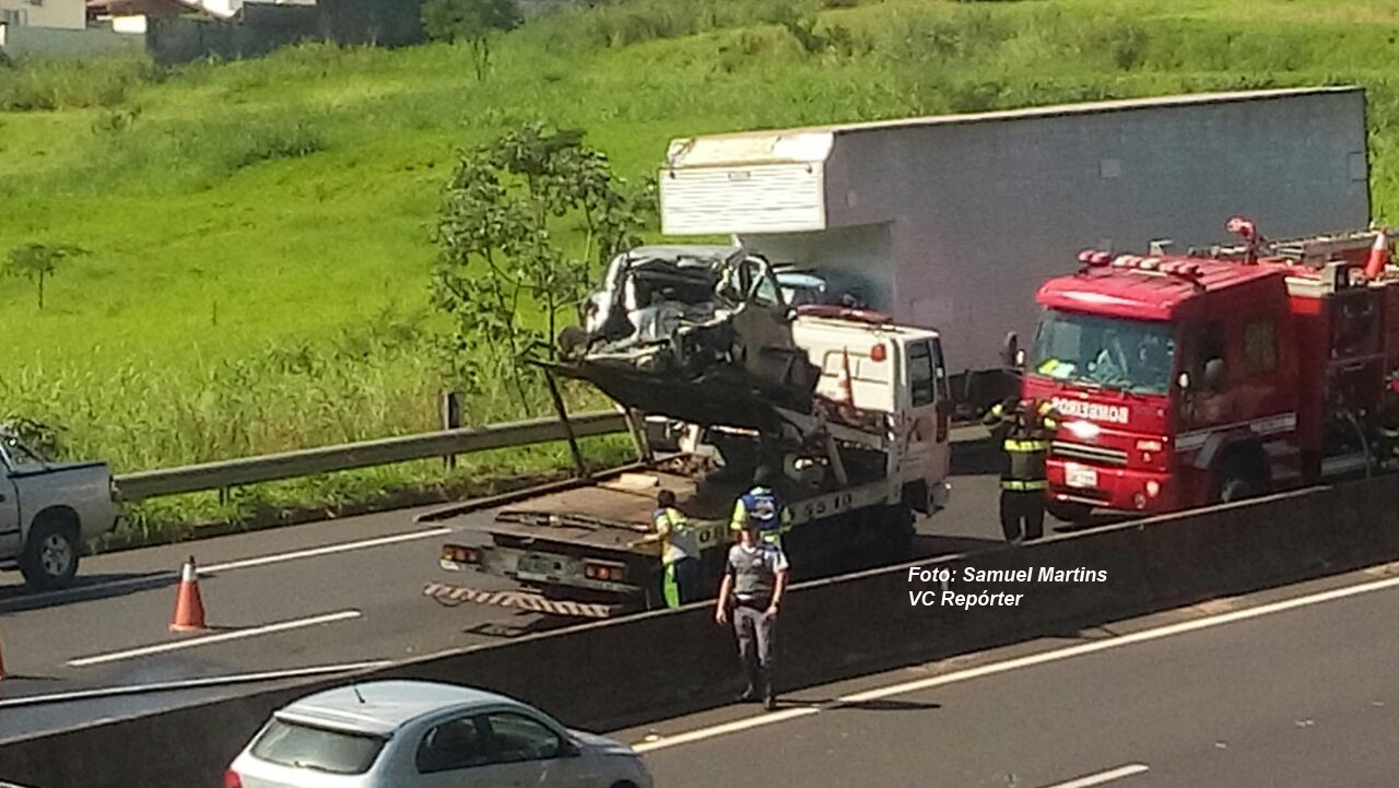Um dos veículos envolvidos no acidente é retirado do local: destruição e feridos.