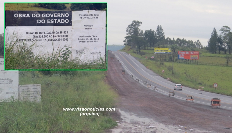 A ARTESP (Agência de transporte do Estado de São Paulo) divulgou o cronograma de obras na rodovia SP-333, após a concessão à iniciativa privada. A recuperação começa em julho e, segundo a nota, o trecho passando por Marília é uma das prioridades. Prevê prazo de conclusão dentro de um ano, ou seja, em julho de 2018. O trecho em Marília estava abandonado há quase quatro anos.