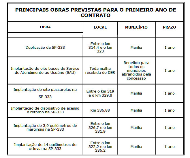 Desse total, R$ 2,1 bilhões deverão ser investidos em obras e melhorias para os usuários já nos oito primeiros anos da concessão. Parte das obras de ampliação principal -- 8,6 quilômetros de duplicação da SP-333 em Marília -- terá de ser entregue ainda no primeiro ano de contrato.