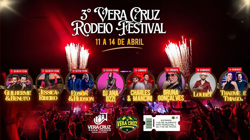 Em sua terceira edição, o Vera Cruz Rodeio Festival está de volta para oferecer à comunidade de Vera Cruz e região não apenas entretenimento de qualidade, mas também uma oportunidade única de contribuir para causas nobres. Começando nesta quinta-feira (dia 11) prossegue até domingo (dia 14), este evento promete agitar a região com uma programação repleta de grandes shows e momentos de solidariedade.