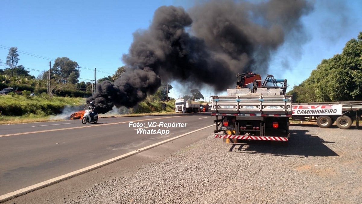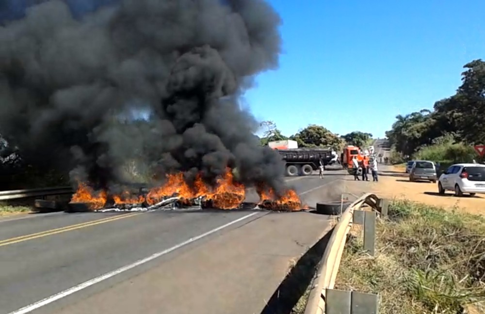 Caminhoneiros colocaram fogo em pneus e fecharam rodovia por 15 minutos.
