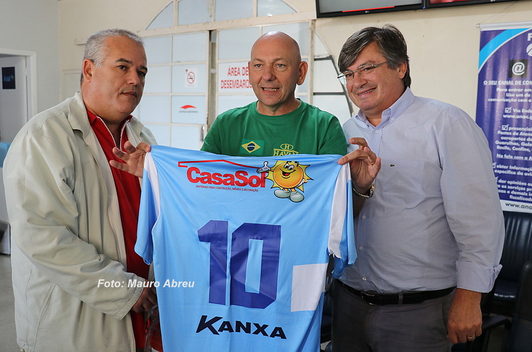 Empresário recebe camisa do MAC antes de embarcar em seu jato.
