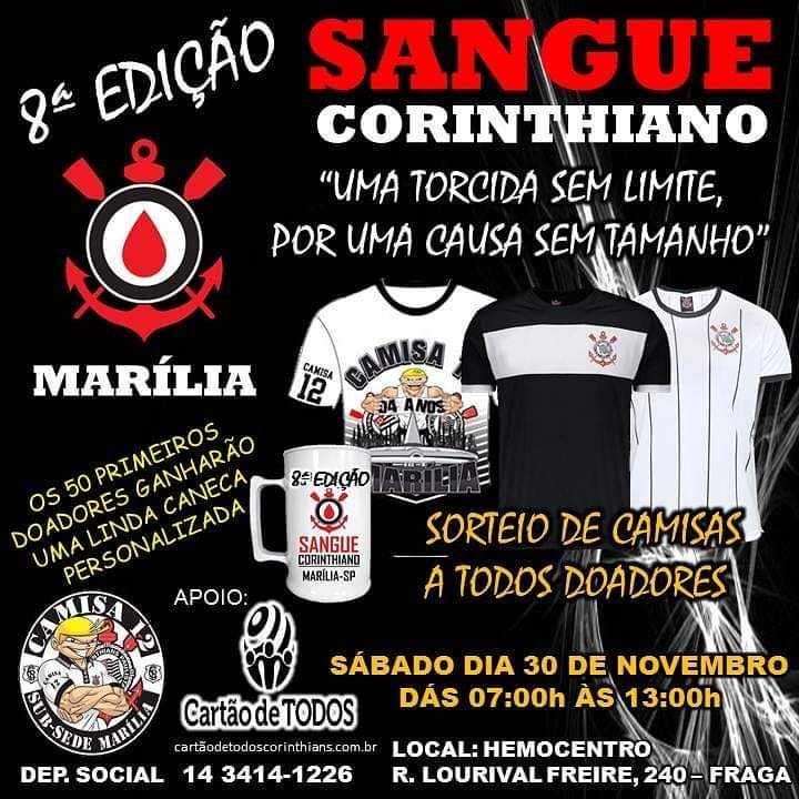 Centenas de corintianos de Marília e região estão sendo incentivados para participar da campanha “Sangue Corinthiano” que será realizada no sábado (30/11), das 7 às 13 horas, no Hemocentro.