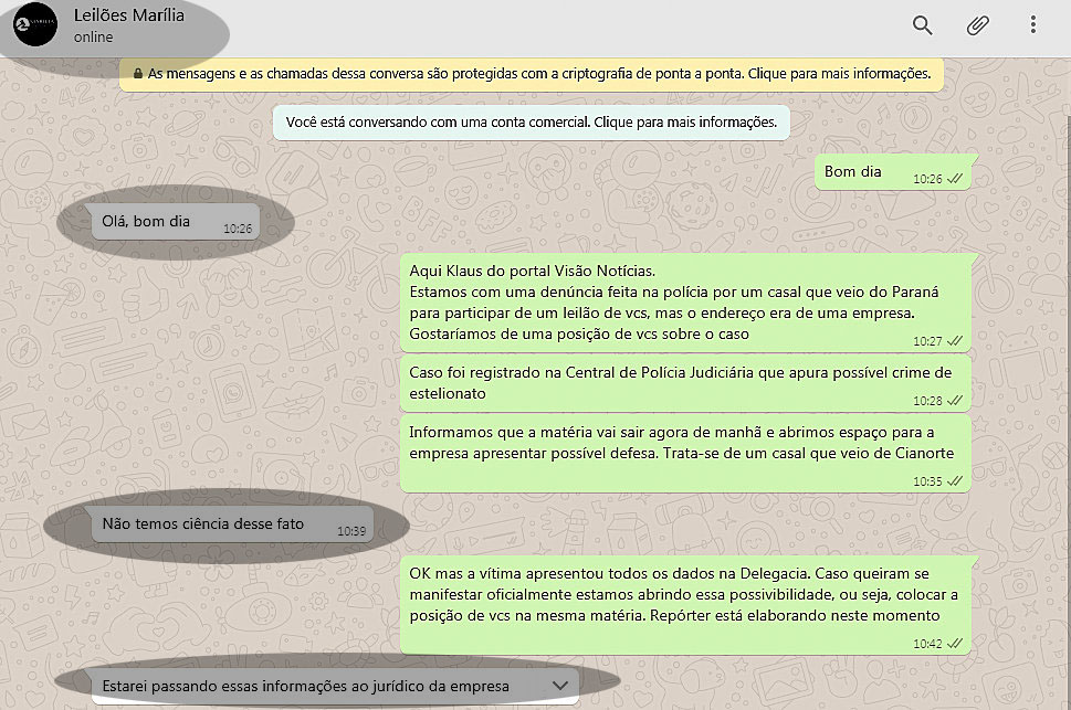 Com o número do WhatsApp que consta no site da empresa, o Visão Notícias enviou mensagem. O atendente, após saber do que se tratava, simplesmente respondeu que "Não temos ciência desse fato".
