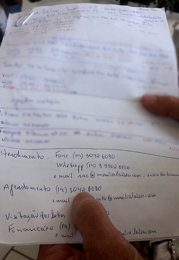 As anotações que o aposentado fez sobre os produtos oferecidos pela empresa e localização em Marília. Trabalho investigativo.