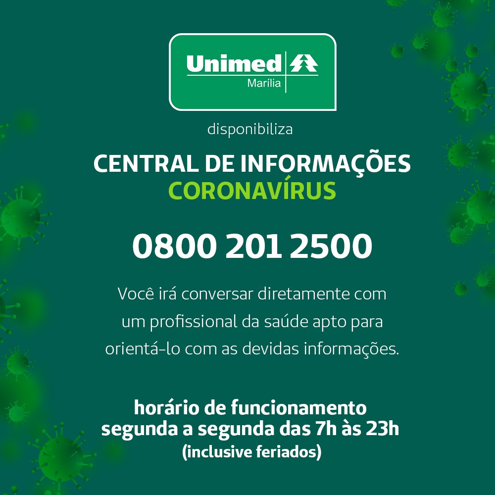 Com objetivo de orientar tanto os seus beneficiários como a população em geral, sobre como proceder em caso de sintomas sobre o Covid19 (coronavírus), a Unimed Marília implantou uma central de informações. Basta ligar para o telefone 0800-2012500 com horário de funcionamento das 7h às 23h, todos os dias (inclusive feriados, sábados e domingos).