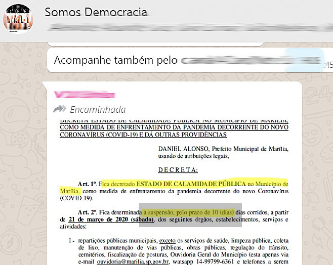 A assessoria de imprensa divulgou uma nota oficial esclarecendo o período correto de funcionamento das medidas. Todas as informações foram anunciadas pelo Chefe do Executivo durante pronunciamento oficial na tarde desta sexta-feira, através de uma “live” transmitida ao vivo pelo Facebook da Prefeitura de Marília