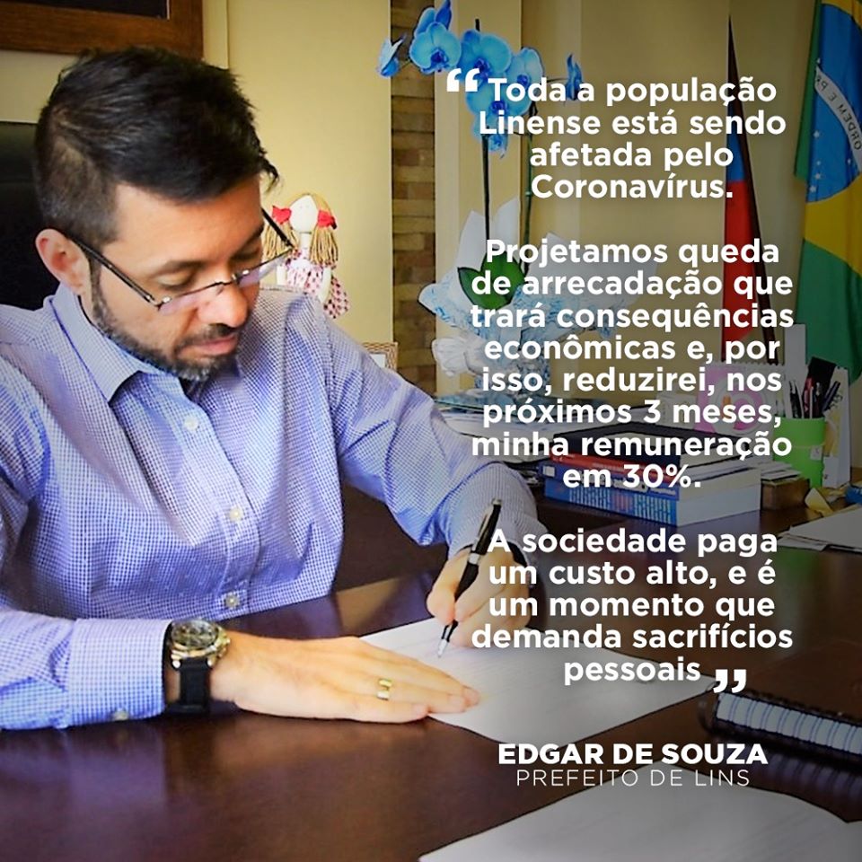 O prefeito de Lins, Edgar de Souza, decidiu cortar o próprio salário como forma de reduzir as despesas do município frente à queda na arrecadação provocada pela pandemia do novo coronavírus (Covid-19).