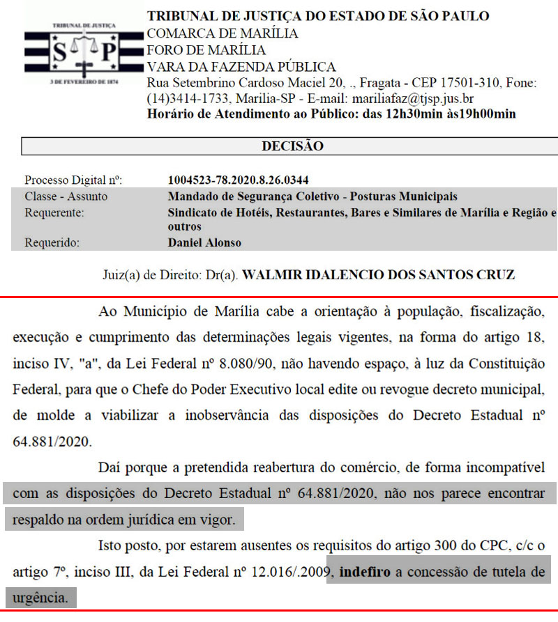 Este é um dos trechos da decisão tomada pelo juiz Walmir Idalêncio dos Santos Cruz, da Vara da Fazenda Pública de Marilia, ao rejeitar em despacho divulgado nesta quarta-feira, o pedido de liminar para reabertura imediata de empresas e serviços proibidos de funcionar na cidade por força da quarentena contra o coronavírus. Pela decisão, a cidade deve seguir o decreto estadual de quarentena.