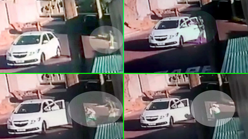 Na sequencia de fotos, o atirador saca o revólver e se aproxima do carro atirando. A vítima abre a porta, tenta correr e é novamente alvejada. Depois, consegue se refugiar dentro de casa, enquanto o criminoso consegue fugir.