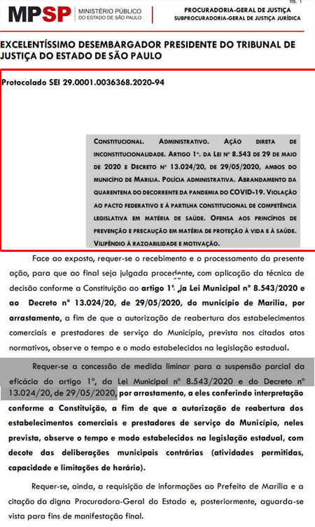 Como já era esperado pelo setor jurídico da Prefeitura, a A Procuradoria Geral de Justiça do Estado, ligada ao Ministério Público em São Paulo, ajuizou uma Ação Direta de Inconstitucionalidade, com pedido de liminar para suspender parte do decreto do prefeito Daniel Alonso que autorizou o funcionamento de atividades comerciais que não estavam previstas na fase 2 (cor laranja) do Plano SP.