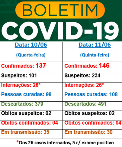 O número de mortes permaneceu o mesmo (quatro óbitos) e também de suspeitos (dois), bem como de internações (26 - sendo cinco pessoas com diagnóstico positivo).