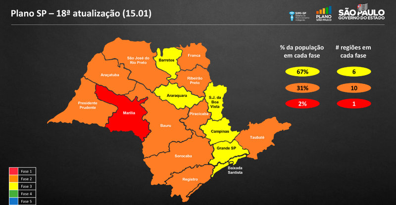 A 18ª atualização do Plano São Paulo foi anunciada também no início da tarde desta sexta-feira (15) e colocou a DRS (Diretoria Regional de Saúde) de Marília, formada por 63 municípios, na fase mais restritiva do plano, onde apenas os serviços considerados essenciais poderão funcionar.