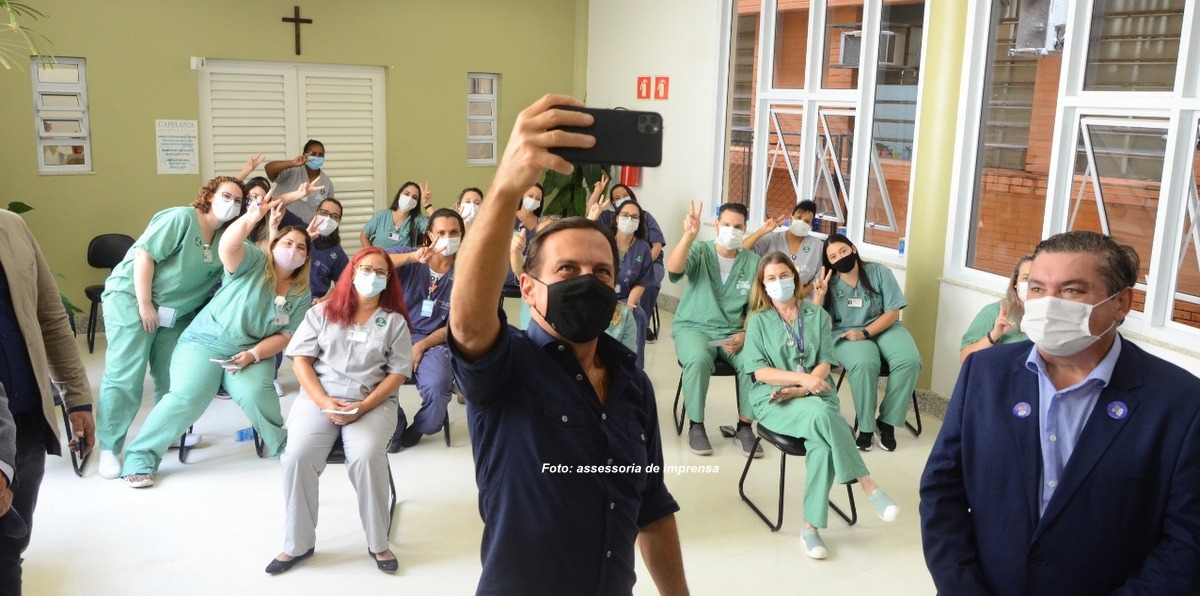 "Tem segurança em tudo qto é lugar. Funcionarios tem dar uma volta enorme por fora para buscar material na central para atender o paciente", relatou um funcionário do complexo do HC, em mensagem via WhatsApp, acrescentando que servidores escolhidos para o ato de vacinação receberam uniformes novos.