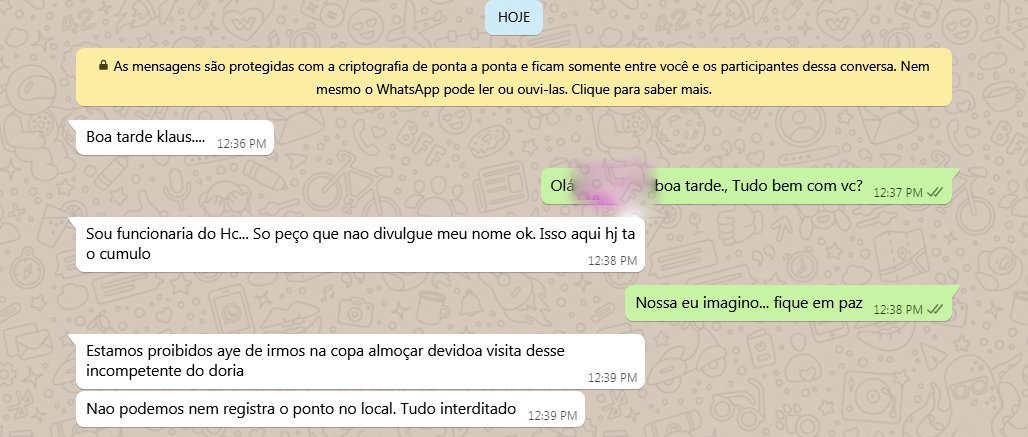 O portal Visão Notícias recebeu reclamações (via WhatsApp) de funcionários do HC que praticamente ficaram sem almoçar e até mesmo de se locomover por causa da visita do governador Doria.