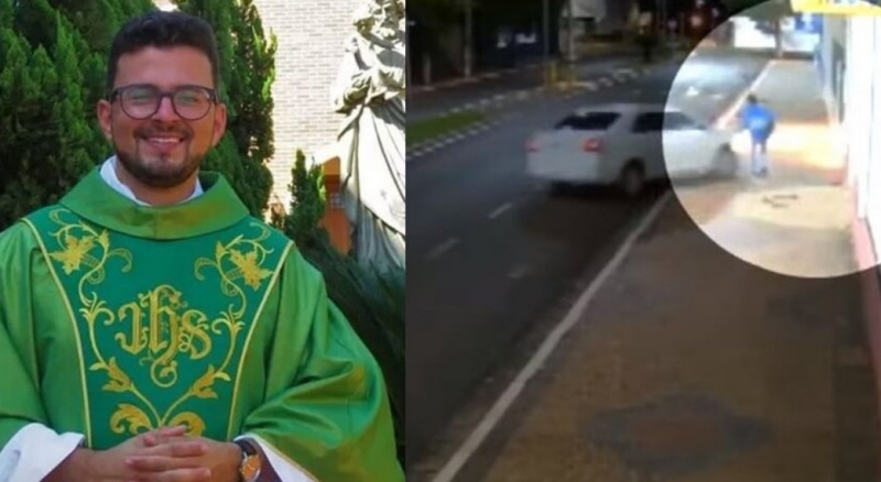 Após prensar o suspeito do furto contra a vitrine de uma loja de tintas, o padre retorna à via e sai em disparada do local. Nas imagens, é possível ver parte da lateral dianteira do carro danificada.