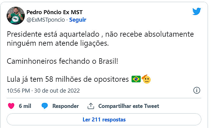 “72 horas para o exército tomar conta [...] Não tem político nenhum que vai chegar perto de nós e só saímos da rua quando o Exército intervir. É o nosso futuro que está em jogo”, afirmou um dos integrantes do movimento em vídeo publicado na internet.