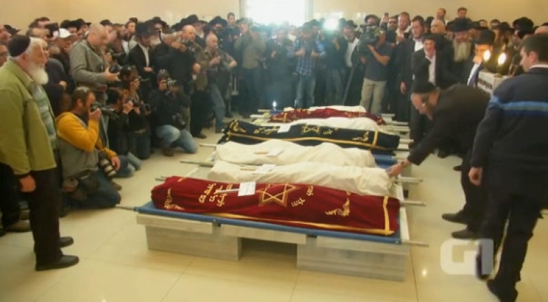 Os corpos das três meninas e quatro meninos, de entre 5 e 16 anos, foram levados de Nova York a Israel, onde foram levados a Jerusalém em comboio escoltado pela polícia.