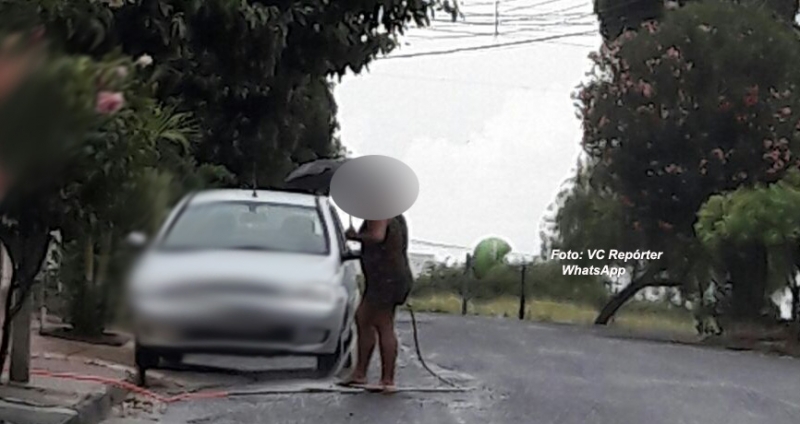 No momento em que grande parte da cidade enfrentou uma semana de muitos transtornos, devido a falta de água, moradores foram flagrados neste sábado desperdiçando água. Internauta enviou fotos ao portal Visão Notícias de uma cena curiosa: mesmo chovendo e usando um guarda-chuva, moradora estava lavando a calçada com uma mangueira.