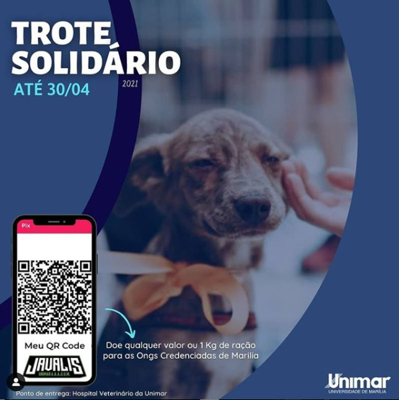 O Trote Solidário das Agrárias está recebendo doações dos quilos de ração na secretaria do Hospital Veterinário da Unimar. Há também como fazer a doação com valor em dinheiro, por meio do PIX no QR Code disponível no instagram e facebook dos @javalisdaunimar.