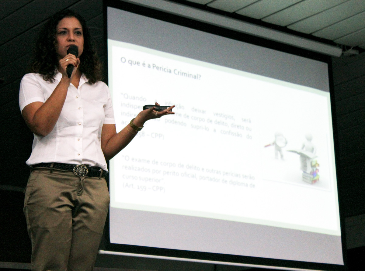 Integrante da equipe da Polícia Científica de Marília durante palestra.
