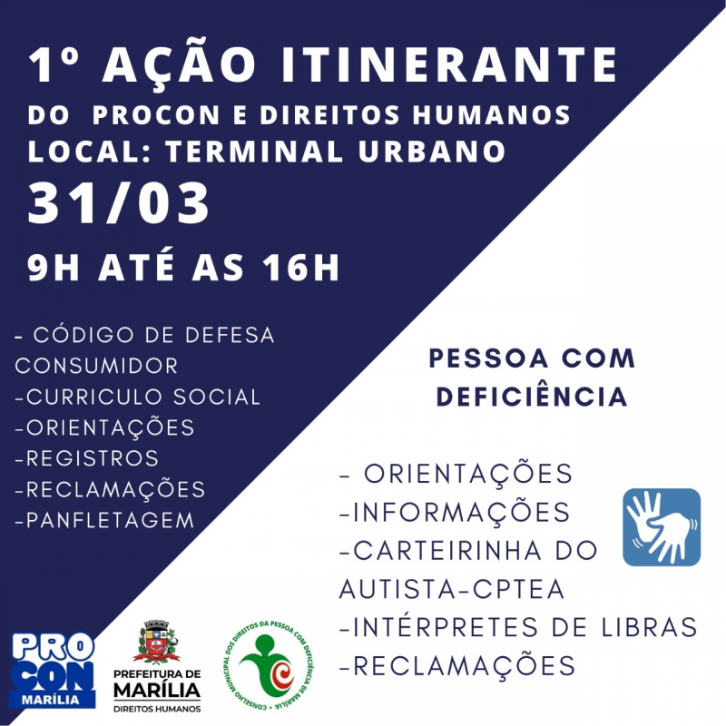 O Procon Municipal de Marília e a Secretaria Municipal de Direitos Humanos realizam nesta quinta-feira, das 9h às 16h, no Terminal Rodoviário Urbano, a 1ª Ação Itinerante de Inclusão Digital.