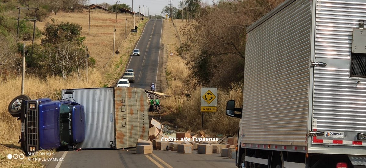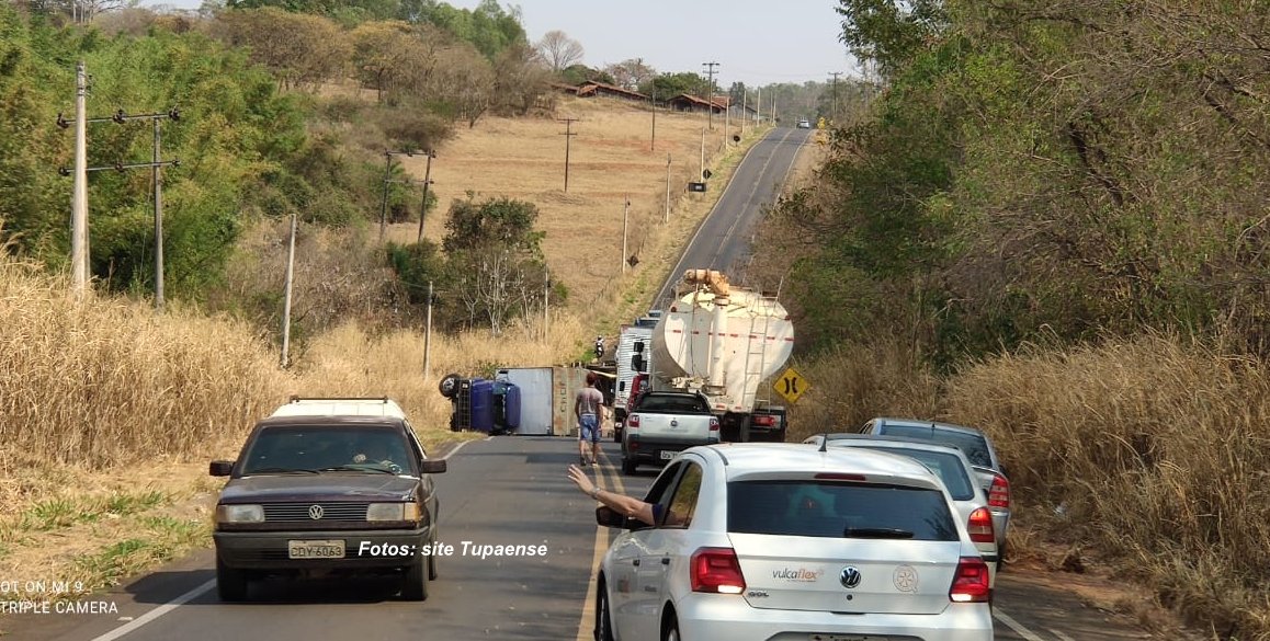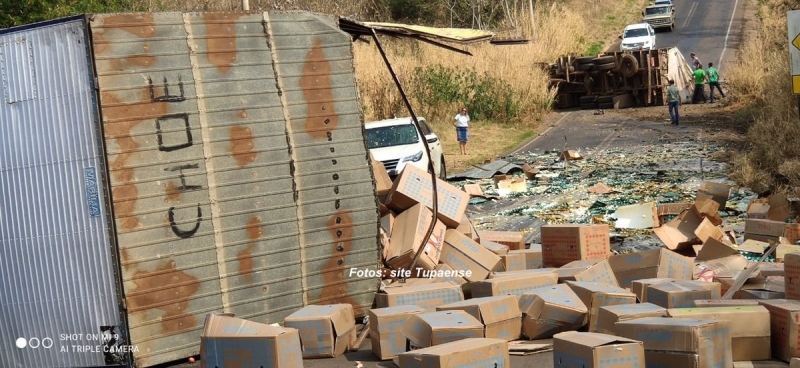 Três pessoas ficaram feridas em um acidente no final da manhã desta sexta-feira, na estrada vicinal que liga Tupã a Bastos. Foi uma batida envolvendo dois caminhões que acabam tombando. As cargas ficaram espalhadas e as pistas estão totalmente interditadas.