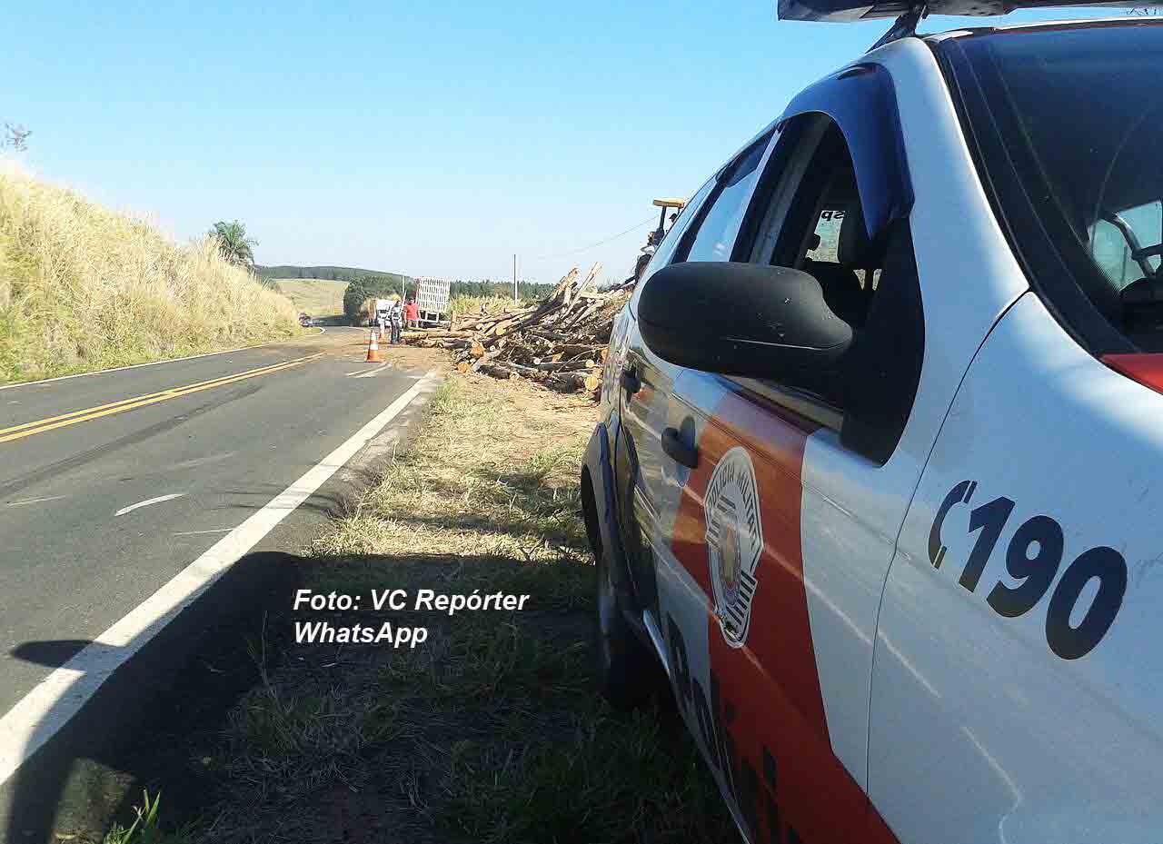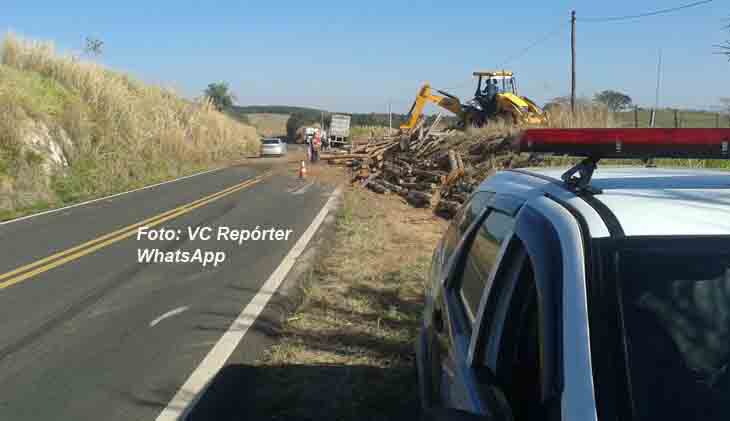 motivo foi o tombamento de uma carreta carregada com toras de eucalipto. A carga ficou toda espalhada pelas duas pistas. O motorista não sofreu ferimentos.