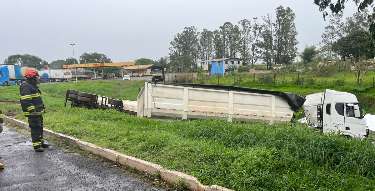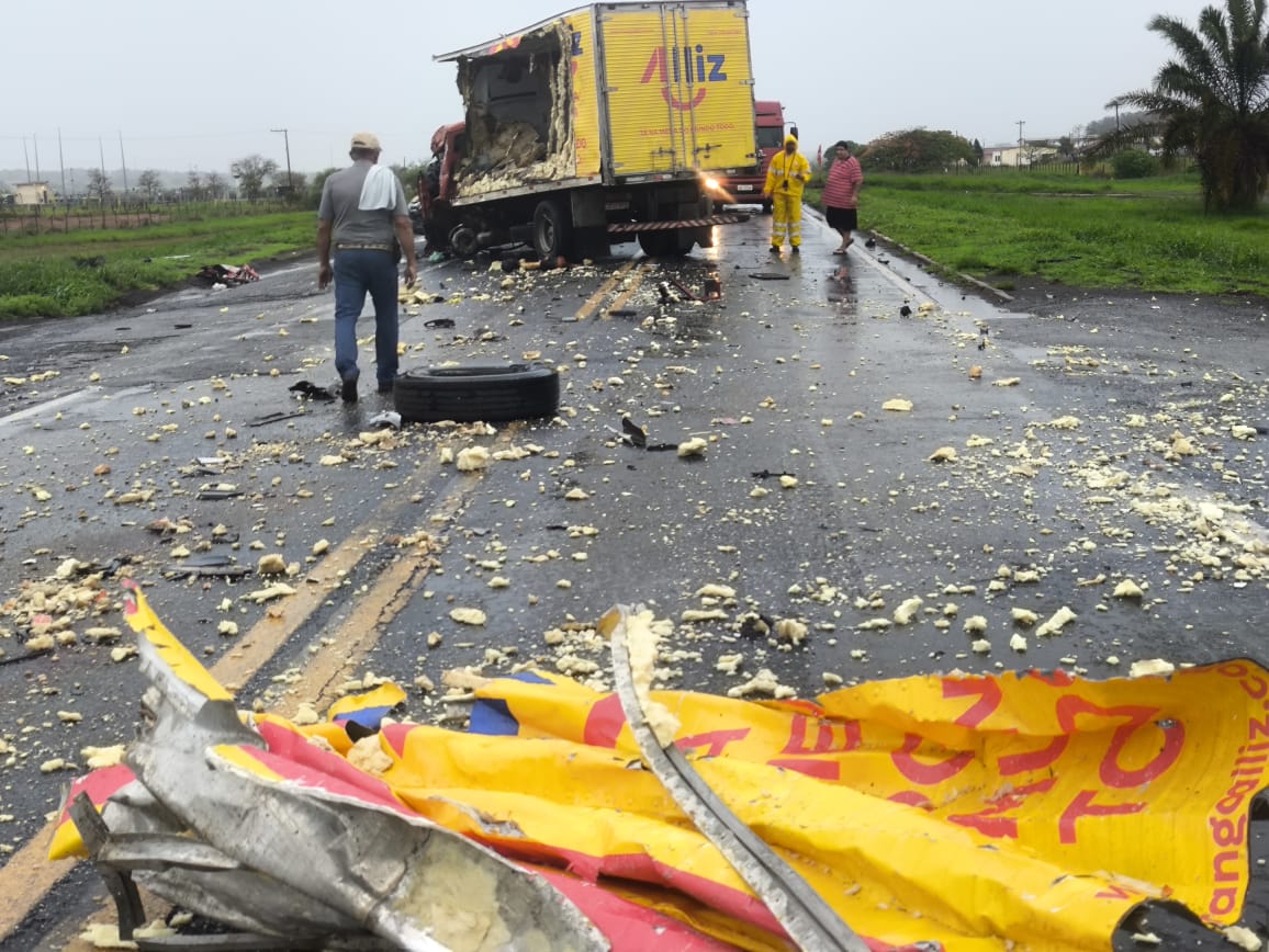 Com o impacto, a carreta "nove eixos" acabou indo parar em um buraco existente ao lado da rodovia. O caminhão ficou com o baú completamente destruído e a frente também danificada.