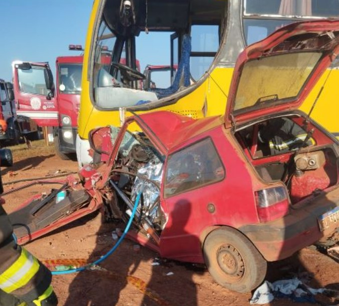 Um acidente neste sábado (16), em Platina, na região de Assis, envolvendo um ônibus que transportava trabalhadores rurais e um carro, causou a morte de uma pessoa e mais quatro em estado grave. A vítima fatal ficou com o corpo preso nas ferragens.