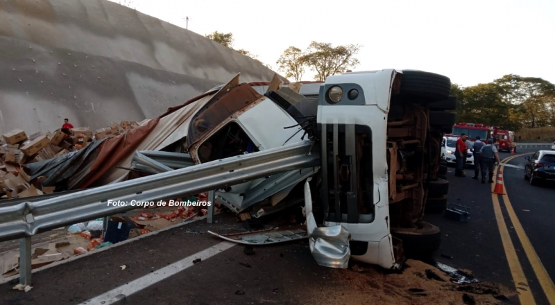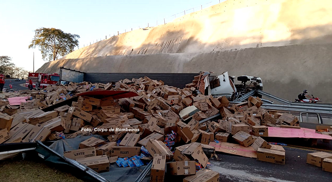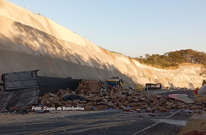 Por motivos que ainda estão sendo apurados, o motorista perdeu o controle, tombando numa curva. A carga ficou espalhada pelo acostamento.