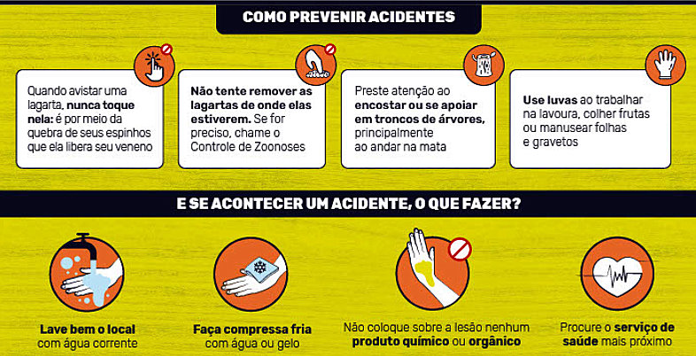 Em caso de contato com qualquer tipo de lagarta, a recomendação é lavar o local com água corrente e sabão neutro, e realizar compressas de gelo para amenizar a dor.