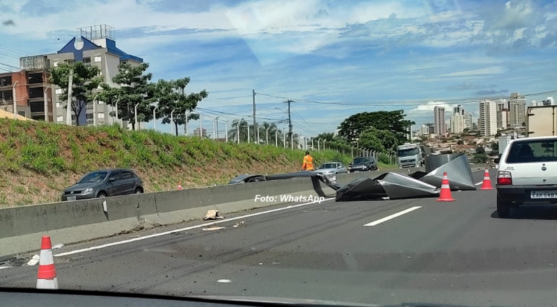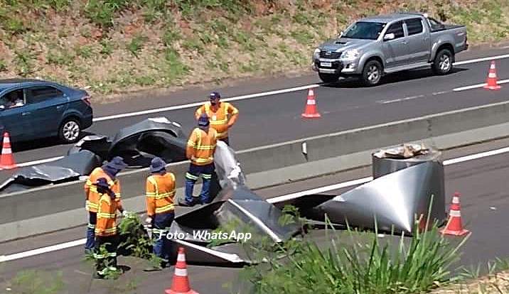 Já no sentido oposto, uma bobina de aço acabou se soltando da carreta e o material ficou espalhado pela pista.