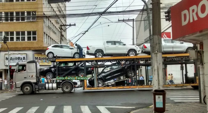 Uma carreta do tipo "cegonha" (que transporta carros em sua carroceria) se enroscou em fios de energia em plena avenida Sampaio Vidal, no centro de Marília, na tarde desta segunda-feira, 22.