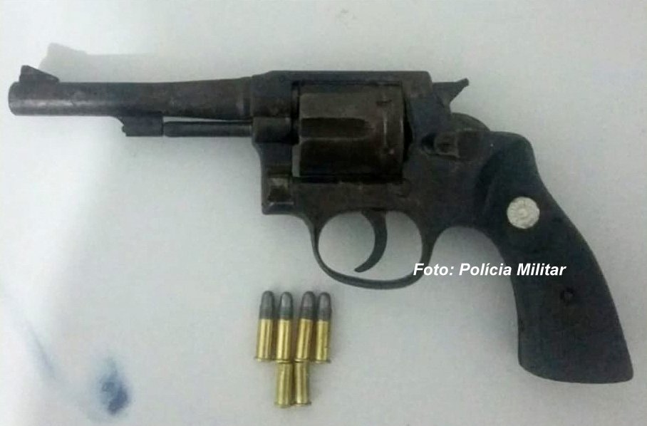 Revólver e munições apreendidos com o acusado.Durante a fuga, retirou um revólver que trazia na cintura e jogou num quintal, para se livrar do crime de porte ilegal de armas. Mas, a arma foi localizada e o acusado detido.