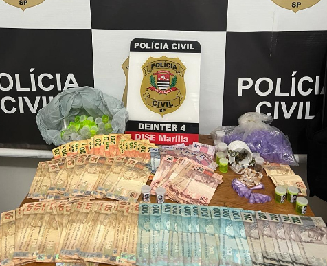 Na casa, foi preso o jovem traficante, além de pequenos potes cilíndricos com maconha e colante do traficante colombiano “Pablo Escobar”, embalagens vazias e R$ 6.445,00 em dinheiro.
