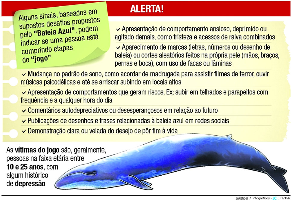 Os administradores do "Baleia Azul", chamados de "curadores", agem em grupos fechados nas redes sociais e aplicativos (Facebook e WhatsApp), sempre durante a madrugada. São lançadas 50 missões de graus variáveis de dificuldade aos jogadores, como automutilações. A última tarefa seria o suicídio (veja dicas de alerta no quadro ao lado). Fonte: JC NET