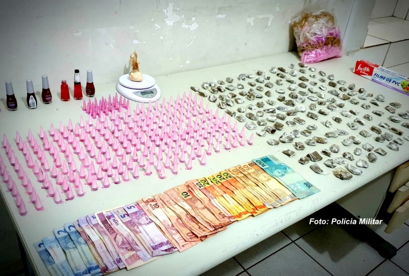 Em poder dele e em outro local indicado, os militares encontraram 155 porções de maconha, 234 porções de cocaína, 24 porções de crack e a quantia de R$ 665,00, em dinheiro, uma balança de precisão e um pacote com pinos vazios.
