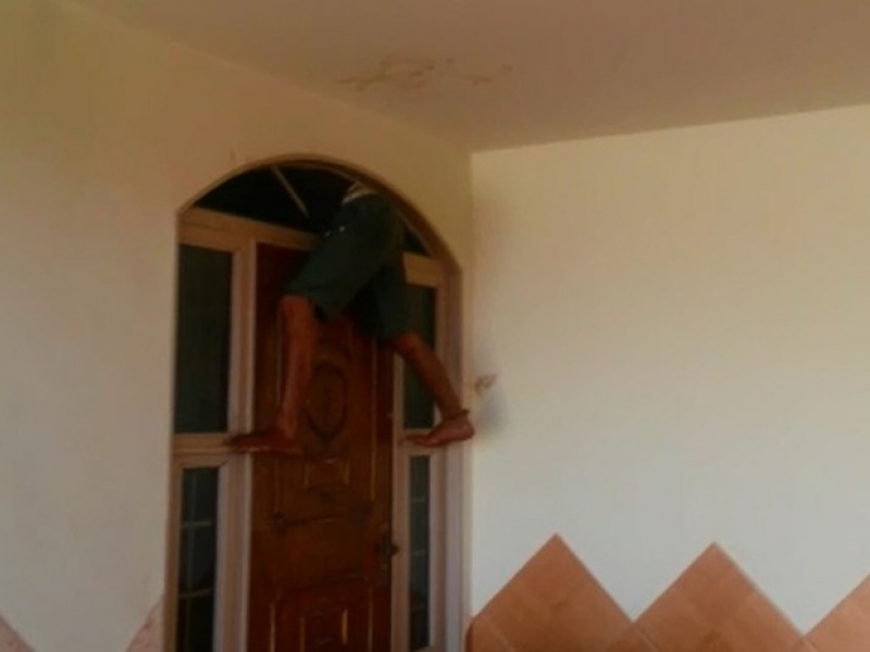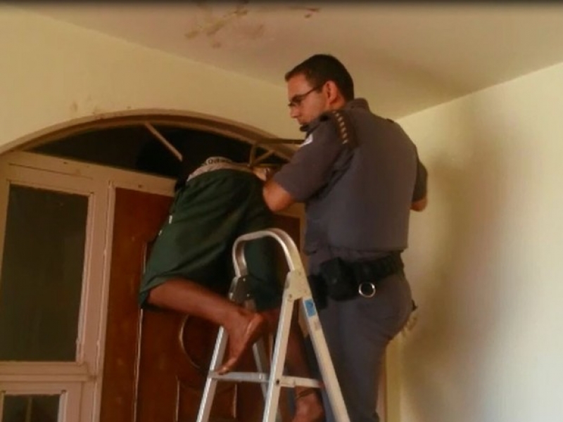 Ele se apoiou na casinha de um cachorro, mas ficou entalado na tentativa e teve de ser resgatado por policiais. Ainda de acordo com a PM, antes de quebrar o vitral da sala, ele quebrou o vidro do banheiro, mas desistiu de entrar por lá.