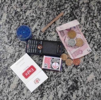 Durante a vistoria, foram encontrados: um maço de cigarros e uma caixa de fósforo parcialmente consumidos, um recipiente apropriado para guardar maconha, um telefone celular, dinheiro e um cigarro de maconha, que foi jogado quando a viatura estava chegando.